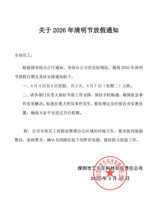 一、4月4日至4月6日放假,共3天。 二、放假期间,如有需求可以通过电话、微信、邮件等方式联系到相关项目的负责人或业务人员,我们将竭诚为您服务,感谢您的理解与支持!